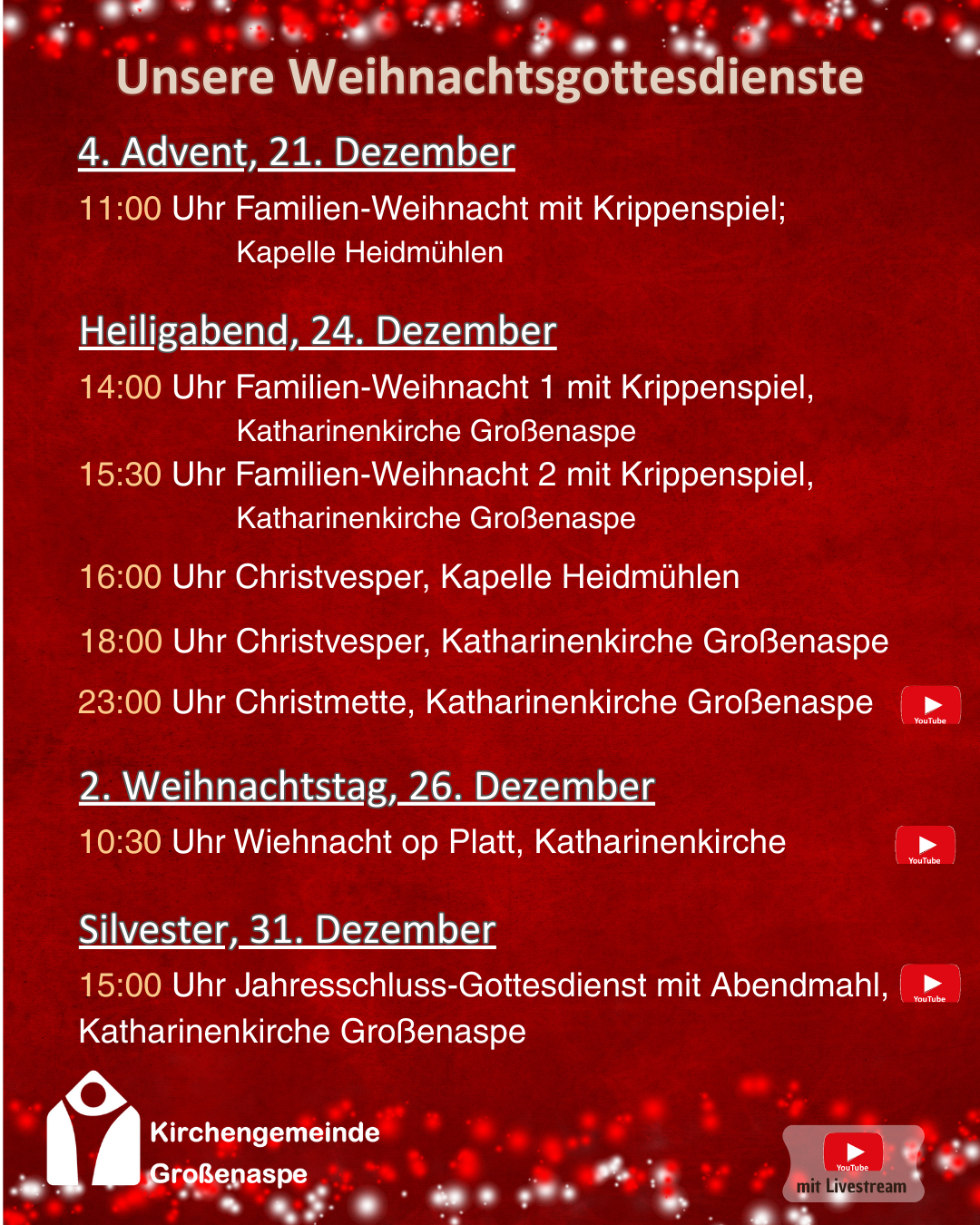 Unabhängig davon bieten wir an jedem Sonntag den Gottesdienst aus Großenaspe im Online-Stream auf unserem YouTube-Kanal an.